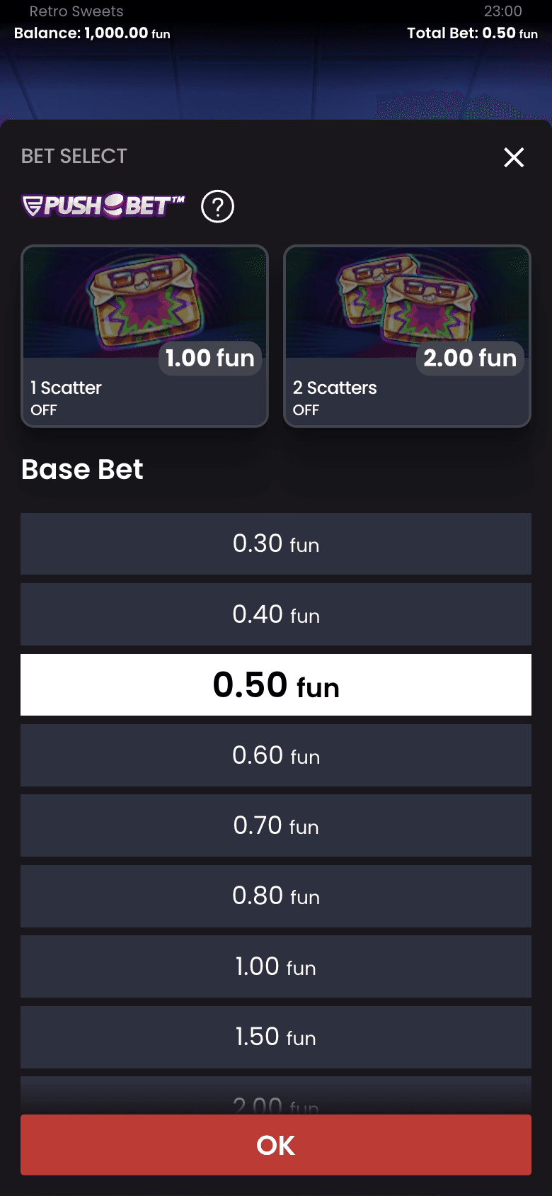 In the first screen the bet select panel is where players change their stake and where Push Bet sits. There is no short description of what Push Bet does, so terms like 1 scatter and 2 scatters are unclear at a glance.